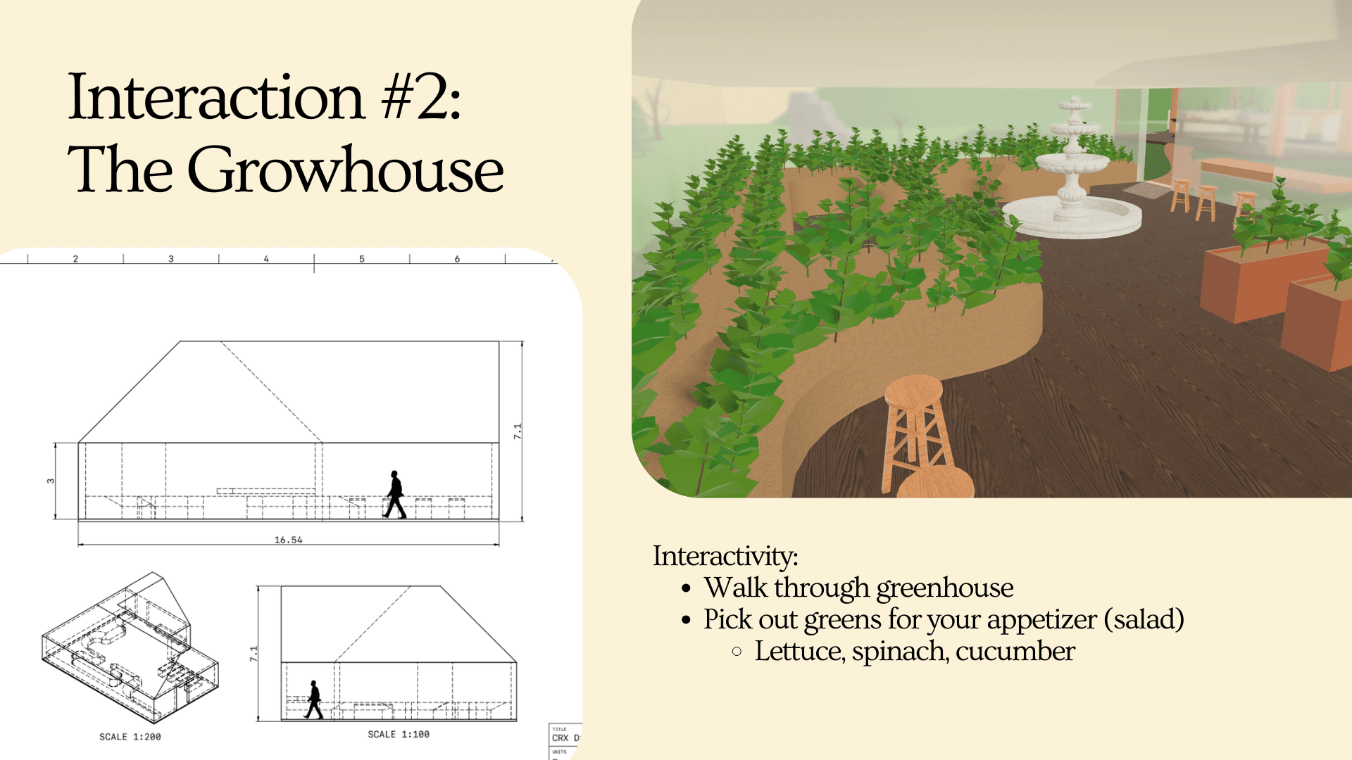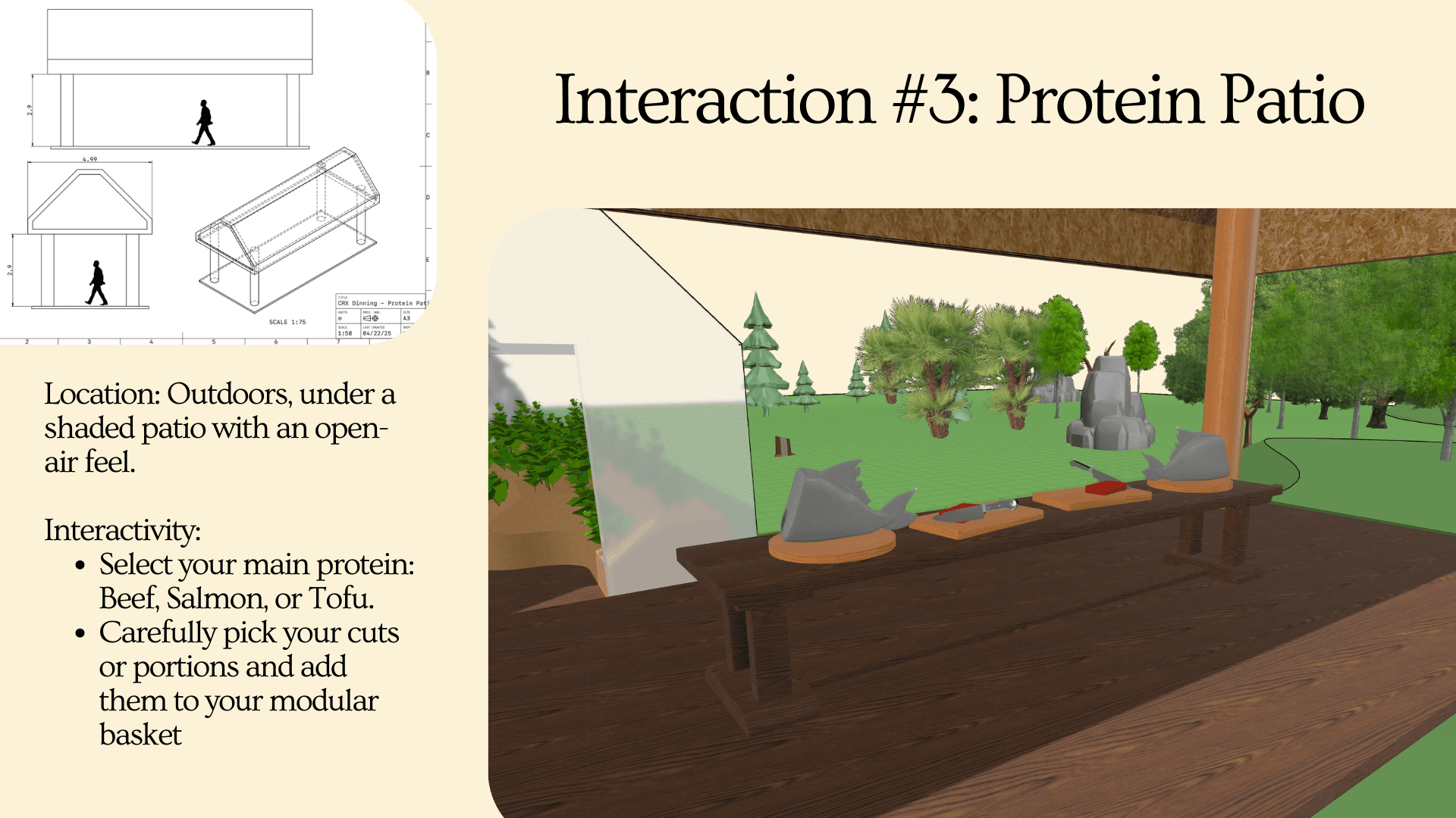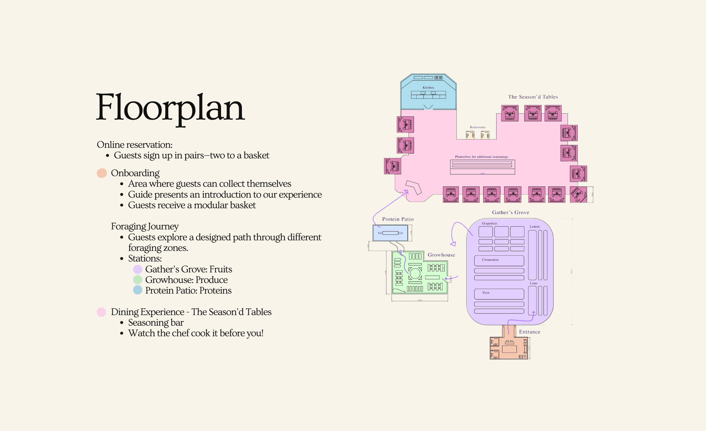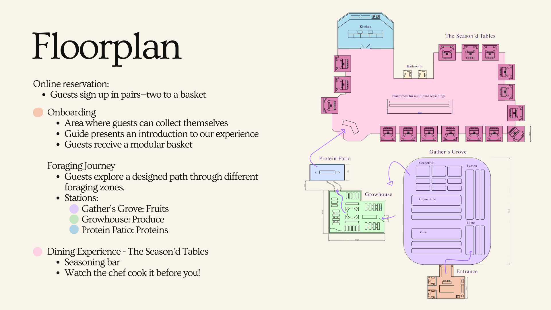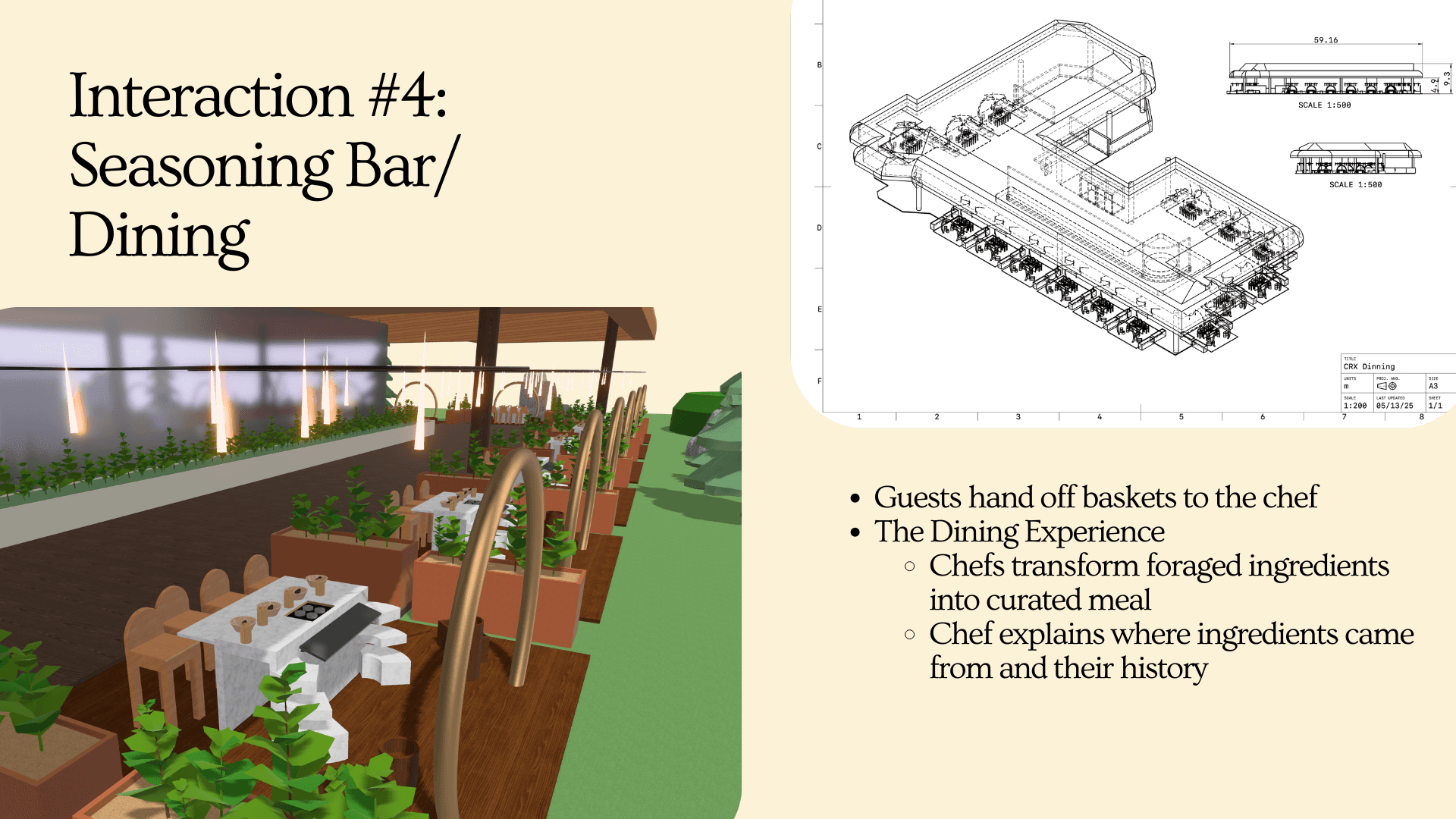 An interactive dining environment where guests forage, select, and share ingredients before dining together.