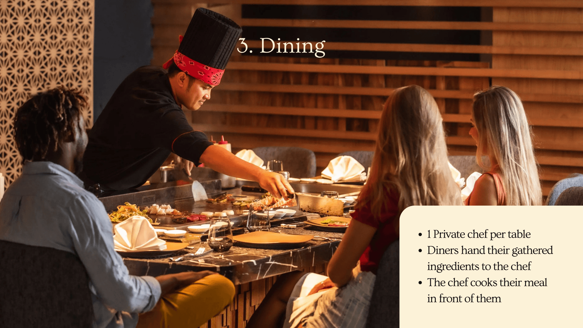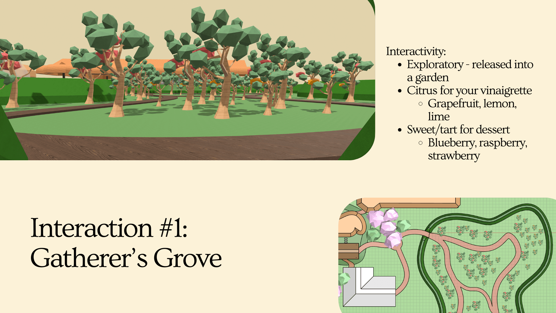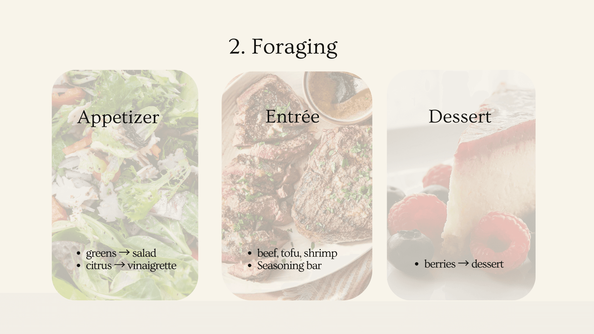 La Foresta reframes dining as a shared activity. Guests move through a designed sequence of foraging zones, gathering ingredients that are later prepared tableside by a private chef taking them through their culinary craft. By participating in selection and handoff, diners become part of the culinary process. The shared act of gathering and preparing builds connection between guests while deepening awareness of ingredients, sourcing, and craft.